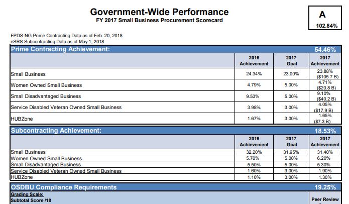 The Trump Administration awarded 23.88% of the value of contracts to small businesses in fiscal 2017, down from 24.34% the prior year.